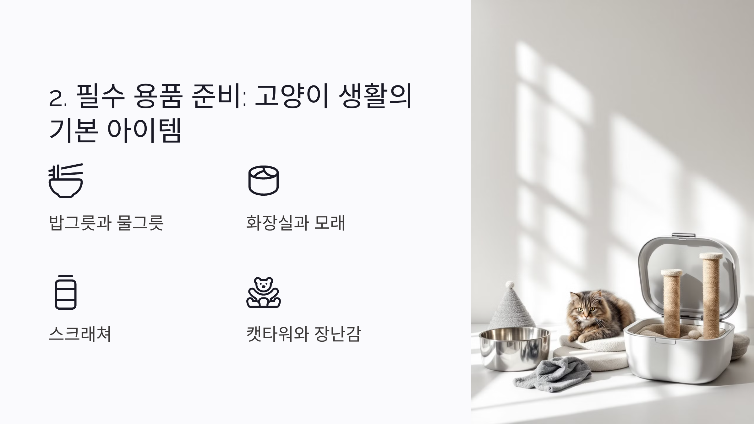 고양이가 쾌적하고 건강하게 생활할 수 있도록 몇 가지 필수 용품을 준비하세요.