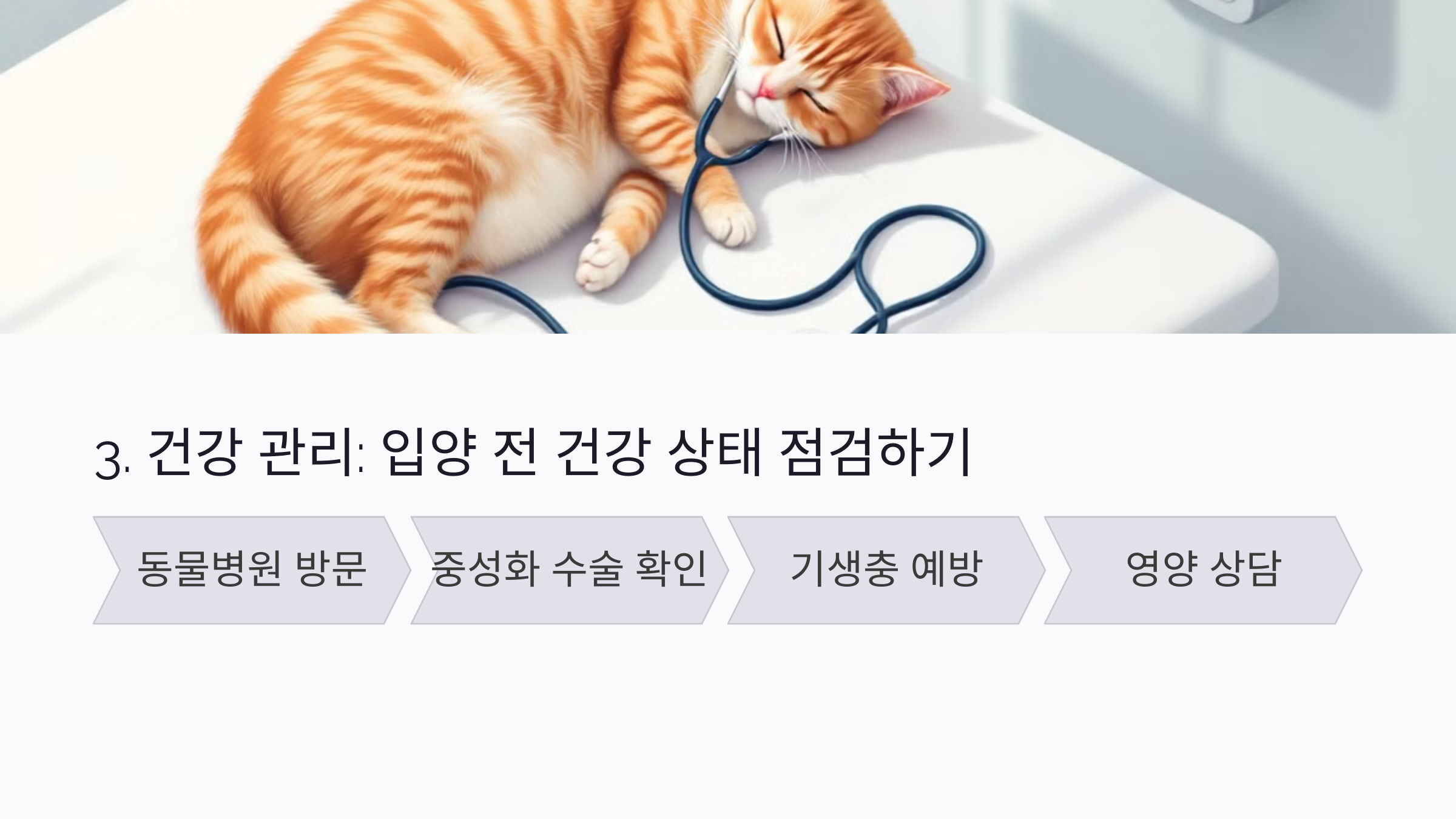 - 동물병원 방문: 고양이 입양 전에 동물병원에서 건강 상태를 확인하고 예방 접종이 필요한지 상담받으세요.